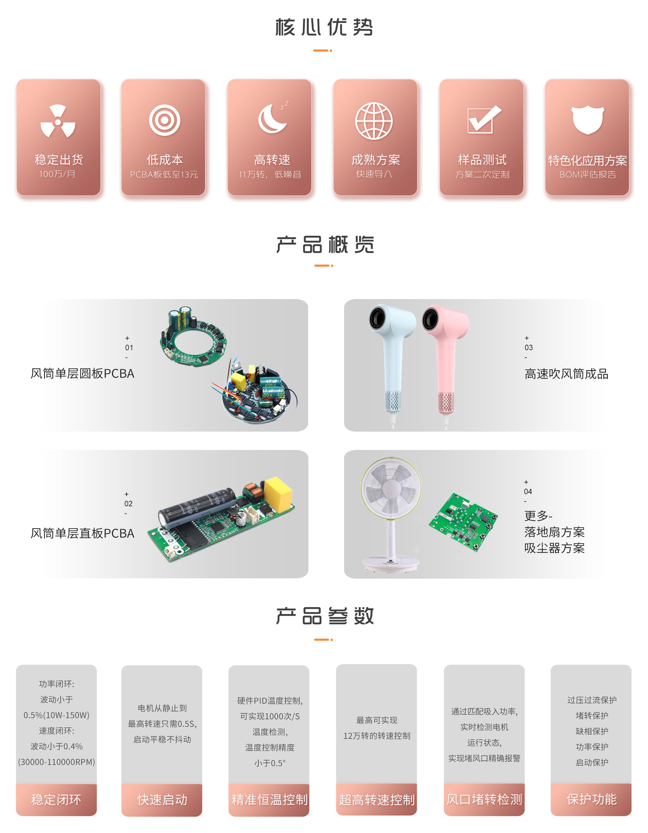 ●啟動迅速、噪聲低、可快速插拔操作 ●支持正弦波FOC無刷電機控制 ●支持多檔風力和多檔溫度控制 ●可過3C、EMC、UL或CE等產品認證 ●提供風道設計和結構設計,快速穩定加速項目落地 ●批量穩定出貨100萬+ |