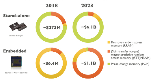 Yole forecasts that by 2023 STT-MRAM will represent about three-quarters of a $1.1 billion annual market with most of the remainder going to ReRAM technologies.
