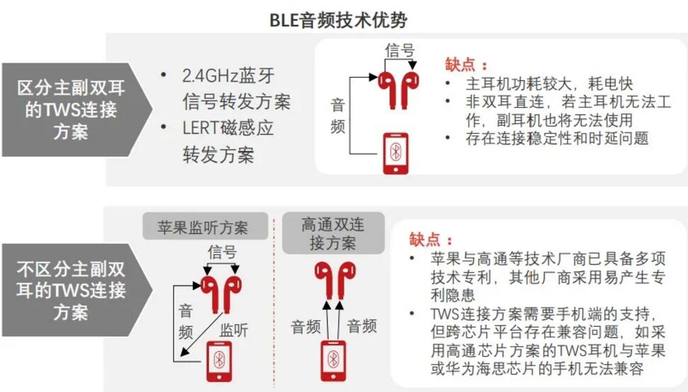 藍牙芯片的重要應(yīng)用場景。早期藍牙標準不支持無線多路直連,無法實現(xiàn)雙耳同步傳輸,普通藍牙耳機僅能實現(xiàn)一對一連接,蘋果采用Snoop監(jiān)聽模式,在一只耳機進行藍牙音頻傳輸時,另一只耳機利用它們之間的私有協(xié)議對其進行監(jiān)聽,達到1對2連接的目的。由于蘋果對監(jiān)聽模式進行專利封鎖,早期安卓TWS廠商主要采用relay轉(zhuǎn)發(fā)模式,將音頻從手機傳至左耳設(shè)備,再由左耳轉(zhuǎn)發(fā)至右耳,但該方案存在諸多劣勢,例如(1)音頻傳輸過程較長造成連接不穩(wěn)定;(2)延遲問題嚴重;(3)接受音頻傳輸?shù)闹饔枚鷻C的電池功耗顯著高于輔用耳機。安卓TWS廠商受限于技術(shù)實力,TWS耳機產(chǎn)品音頻傳輸體驗亟待提升。