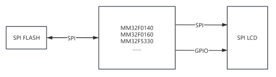靈動微推出的SPI LCD顯示參考方案,通過SPI接口讀取外部SPI FLASH存儲芯片中存儲的字體、圖片等數(shù)據(jù)資源,再通過另外一路SPI驅(qū)動SPI LCD彩屏顯示。對于不同尺寸、不同分辨率的 SPI LCD 彩屏,客戶可以選擇靈動微電子不同規(guī)格的MCU來實(shí)現(xiàn)刷屏效果,硬件設(shè)計(jì)框圖如下所示: