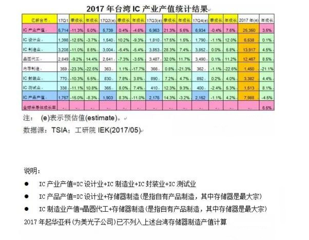 根據臺灣地區工研院IEK與TSIA的最新統計,臺灣地區2017年第一季(17Q1)整體IC產業產值(含IC設計、IC制造、IC封裝、IC測試)達新臺幣5,714億元(USD$18.3B),較上季(16Q4)衰退11.3%,較去年同期(16Q1)成長5.0%。