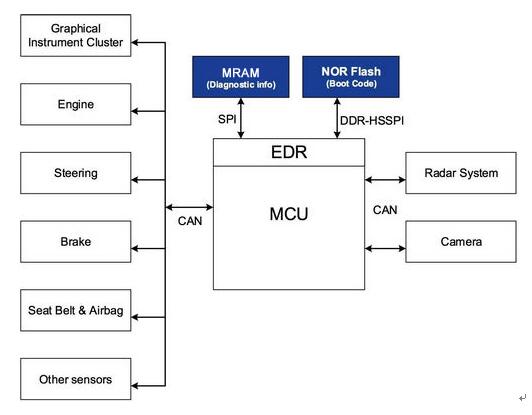 行車記錄儀 (EDR) 是用于記錄事故發(fā)生前各個(gè)重要子系統(tǒng)數(shù)據(jù)的系統(tǒng)??梢园惭b在 ADAS 主控單元,或者安裝在另一個(gè)接收重要傳感器數(shù)據(jù)并與 ADAS MCU 進(jìn)行通信的 MCU 中。如今,工程師可以使用多核設(shè)備為 EDR 功能提供一個(gè)專用的完整 CPU 核,