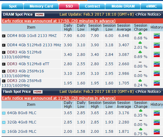 內(nèi)存漲價(jià)已經(jīng)是2016年下半年來(lái)的主流趨勢(shì),2017年開(kāi)年也是如此,而且本季度漲的可能更兇了,從Dramxchange的統(tǒng)計(jì)數(shù)據(jù)來(lái)看,1月份以來(lái)4Gb DDR4顆粒價(jià)格飆升0.51美元,漲幅18%,截至2月3日4Gb DDR4顆粒的高位價(jià)格達(dá)到了3.9美元,平均也有3.4美元,這是2015年7月30日以來(lái)的新紀(jì)錄,創(chuàng)下18個(gè)月來(lái)新高。