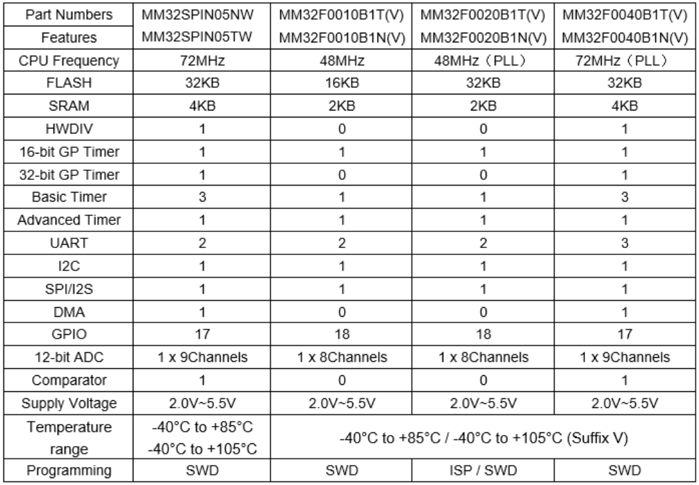 MM32F0020 的封裝相同,但在性能和外設上還是有不少不同之處的,部分可以參照下表所示。此外 MM32F0040 還增加了 MM32F0020 所不具有的外設功能,比如硬件除法器、比較器、32 位定時器等。所以項目之初做好評估,在硬件設計時做好兼容,在替換的時候,需要結合項目實際的硬件需求,做好對比;滿足條件的情況下,可以進行升級。更多詳情可咨詢靈動微官方代理商英尚微電子。
