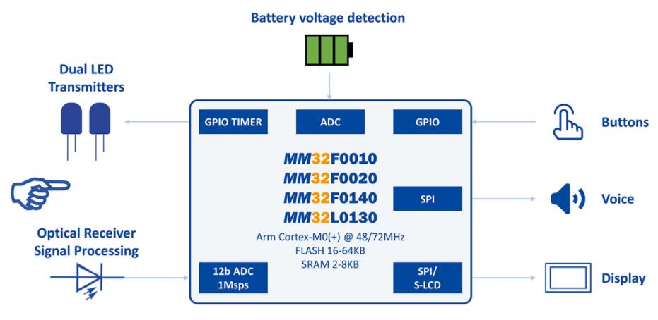 -MM32L0130集成了段碼LCD控制器,且待機功耗可低至100nA,可進一步降低血氧儀的整體功耗,實現更長久和易用的用戶體驗