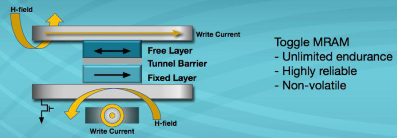 MRAM或磁性隨機存取存儲器使用具有鐵磁性材料的磁性“狀態(tài)”的1晶體管–1磁性隧道結(jié)(1T-1MTJ)體系結(jié)構(gòu)作為數(shù)據(jù)存儲元素。由于MRAM使用磁性狀態(tài)進行存儲(而不是隨時間推移而“泄漏”的電荷),因此MRAM提供了相當(dāng)長的數(shù)據(jù)保留時間(+20年)和無限的耐用性。切換磁極化(寫入周期)是在電磁隧道結(jié)(MTJ)上方和下方的導(dǎo)線中產(chǎn)生脈沖電流的結(jié)果(見圖1)。電流脈沖產(chǎn)生的相關(guān)H場改變了鐵磁材料自由層的極化,這種磁開關(guān)不需要原子或電子的位移,這意味著沒有與MRAM相關(guān)的磨損機制。自由層相對于固定層的磁矩改變了MTJ的阻抗(見圖2)。阻抗的這種變化表示數(shù)據(jù)的狀態(tài)(“1”或“0”)。通過測量MTJ的阻抗來實現(xiàn)傳感(讀取周期)(圖3)。MRAM器件中的讀取周期是非破壞性的,并且相對較快(35ns)。讀取操作是通過在MTJ兩端施加非常低的電壓來完成的,從而在部件壽命內(nèi)支持無限的操作。