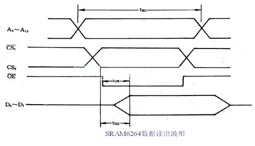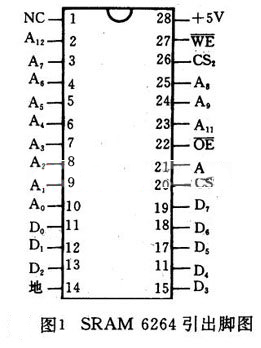 (1) 8K×8bit的CMOSRAM芯片 ① 引線功能。6264(6164)有28條引出線,它們包括:A0~A12為13條地址信號線。D0~D7為8條雙向數(shù)據(jù)線。CS2為兩條選片信號的引線。