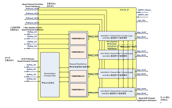 圖2中的STATS_IP架構(gòu)模塊圖標(biāo)出了三個(gè)子部件:每條通道的同地址比較管道(SACOMP)區(qū)塊、請(qǐng)求-復(fù)用-解復(fù)用(REQ_MXDMX_CHn)區(qū)塊以及每條QDR IV應(yīng)用通道1個(gè)的4個(gè)A-B通道配對(duì)計(jì)數(shù)器邏輯(ABCH_CTRL_CHn)區(qū)塊實(shí)例。