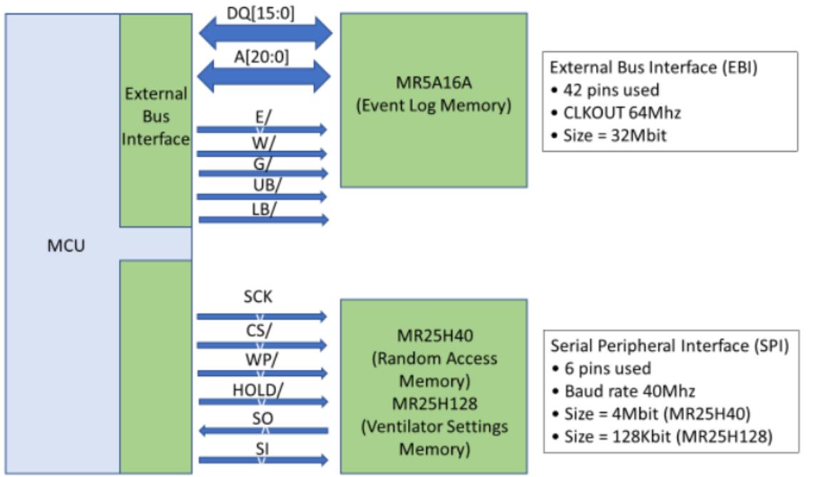 至少4Mb (MR25H40)的MRAM可用于存儲操作軟件程序變量。存儲在MRAM的數據在呼吸機關閉期間保存。